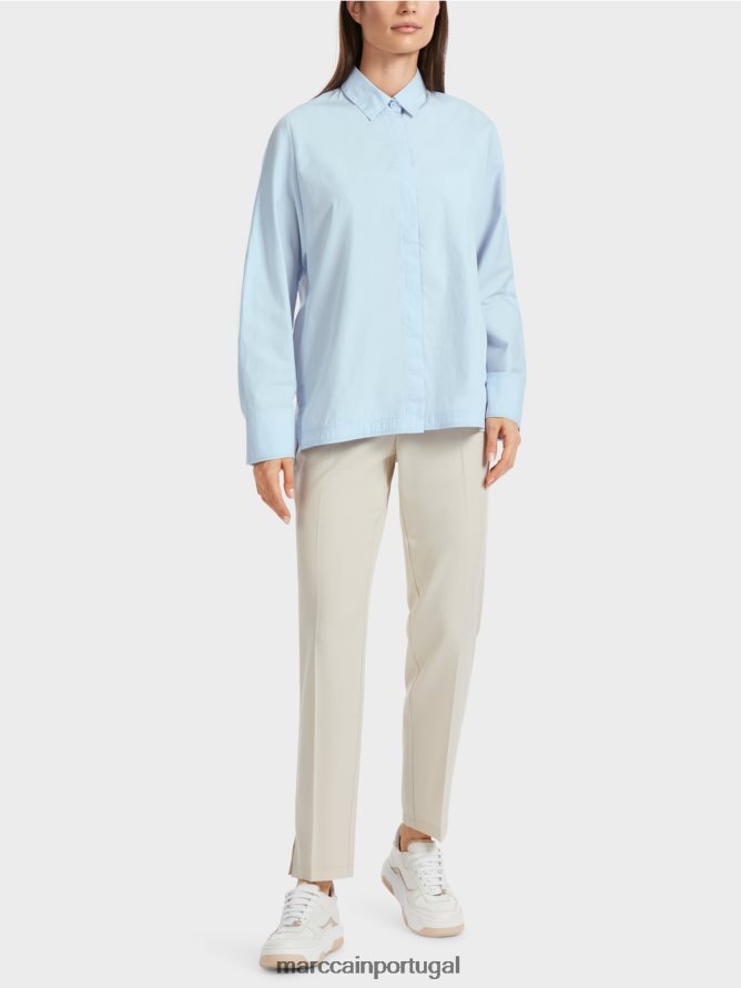 A blusa é feita de algodão orgânico e leva o rótulo de sustentabilidade “repensar”. Estilisticamente, as tradições de roupas ocidentais e orientais se encontram. O corte de quimono tira a gravidade da gola da camisa e da racket de botão escondido. A bainha é acentuada pela costura proeminente e fendas laterais. Na parte de trás, a blusa tem um motivo de impressão minimalista.