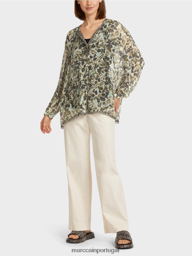 top simples ao estilo da blusa em crepe viscose. A plenitude é criada na parte de trás, que é reunida da costura da sela. O padrão imaginativo é inspirado nos motivos de flora e fauna. A guarnição de estampa de leopardo na placket, decote e bainha dão ao design um toque final elegante.