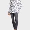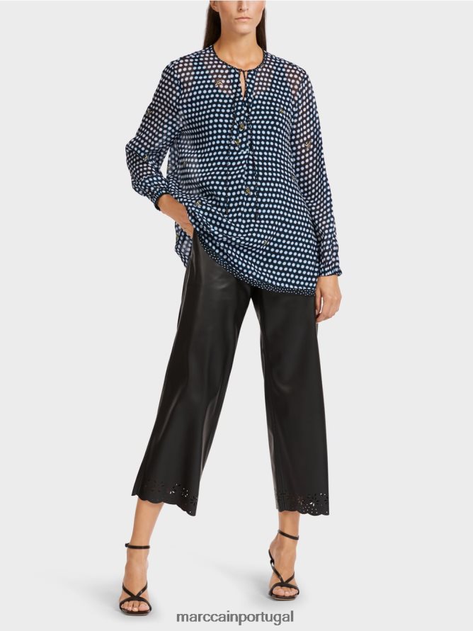 A beleza da blusa está na viscose suavemente fluida e no motivo da abelha, que dá o Padrão de bolinhas mais vibração. O contraste é fornecido com acabamentos em um mini design de bolinhas que adornam a bainha e o decote. A blusa está ligeiramente alargada e puxada na parte de trás da costura do garfo. A placada de botão escondida é curta e o decote pode ser preso com laços de fita. As mangas são finalizadas com um acabamento elástico.