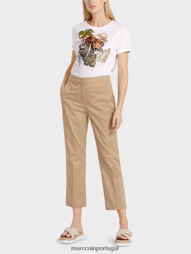 Calças de algodão leve em estilo chino. O estilo é definido pela perna reta e o botão escondido na cintura. O item tem quatro bolsos.