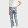 calças femininas de corte do forli do Rótulo de sustentabilidade “Rethink Together”. Essas calças são feitas de algodão com um ligeiro teor de alongamento. Eles vêm no design de cinco bolsos do tipo jeans e apertam com um zip e botão. As bordas abertas da bainha com franjas são um belo detalhe.
