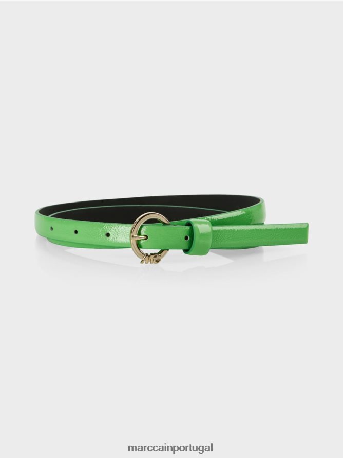 Correia feita de couro revestido. Com sua forma estreita, este cinto de couro é mais adequado para calças e saias de negócios. É feito de Nappa genuíno de couro. A fivela de cinto redonda é feita de metal e decorada com um logotipo MC. Um loop adicional mantém a extremidade da correia no lugar.