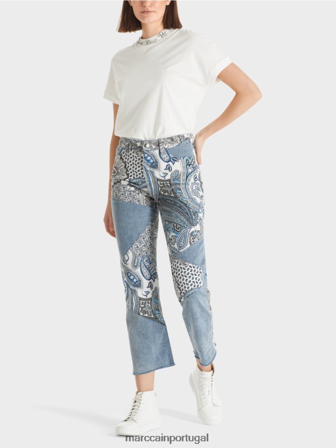 Os jeans Fyli apresentam a Estilo de retalhos casuais, com um padrão de Paisley, e tenha um ajuste feminino. As franjas pequenas nas bordas da bainha enfatizam a aparência legal. O item possui um formato de cinco bolsos e prende com um botão ZIP e brilhante.