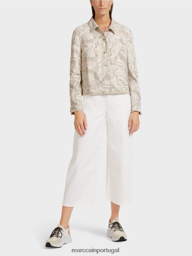 A jaqueta é feita de algodão orgânico e leva o rótulo de sustentabilidade “Rethink Together”. Este item vem em um estilo de jaqueta jeans e possui um acabamento de borda crua na bainha com franjas. A largura pode ser ajustada na parte traseira por meio de um cordão. Os bolsos da fenda do lado da frente são integrados à costura.