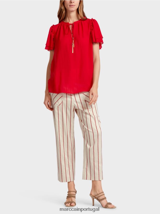 Esta blusa carrega o rótulo de sustentabilidade “repensar juntos”. Feito principalmente de poliéster reciclado, possui um caráter incomparavelmente leve e suave. A largura pode ser ajustada via reunião no decote. As mangas de tampa são finalizadas em flounces em forma de sino. A blusa é presa com uma fita na nuca. Olhando: o elemento decorativo semelhante a uma borla no final das fitas.