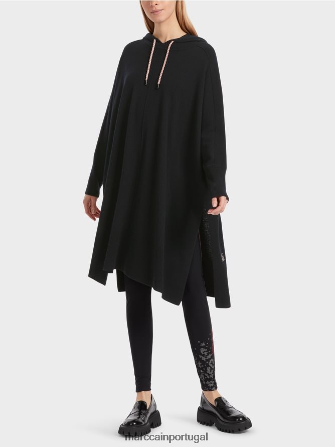 Item de boa aparência feita de uma mistura de lã macia com caxemira. A largura em forma de quimono e extrema faz o item parecer parecido com uma capa. Ao contrário de uma capa, no entanto, as costuras laterais estão fechadas – exceto as fendas na área da bainha. Isso impede a entrada de ar frio. A largura do capô é ajustável por meio de um cordão. O item leva o rótulo de sustentabilidade “Rethink Together”.