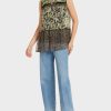 Esta camiseta é solta e principalmente clássica em design. As mangas de meio comprimento com punhos dão uma aparência individual. A impressão na frente possui motivos de pele de animais estilizados com um toque floral para criar um efeito WoW. Os apliques de strass adicionam um toque de luxo. Esta camiseta carrega o rótulo de sustentabilidade “repensar juntos”.