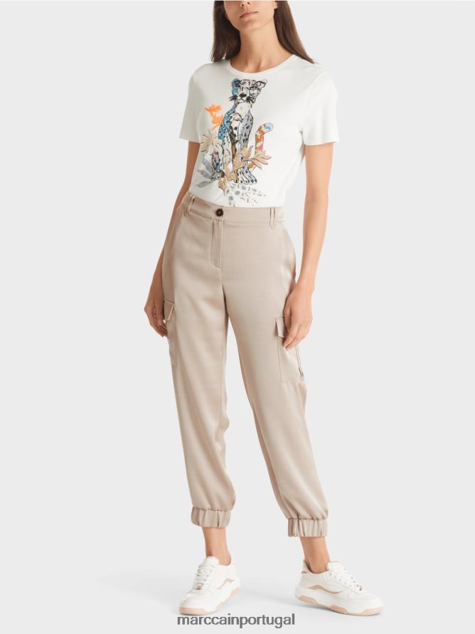 Modelo de calças: com poliéster reciclado e suportar o rótulo de sustentabilidade “repensar juntos”. O material delicadamente cintilante fornece uma aparência exclusiva. O item possui bolsos de solta, uma silhueta descontraída e uma altura regular da cintura. Bolsos casuais de carga e algemas com uma banda elástica ampla caracterizam o estilo.