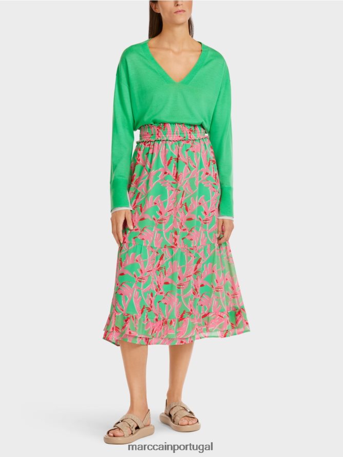 saia em material levemente drapeado com uma ampla silhueta A-line. Esta saia midi feminina apresenta um padrão floral. Seus escalões em camadas são os destaques de sua aparência romanticamente bonita. A cintura alta combina bem com os complexos detalhes de queda.
