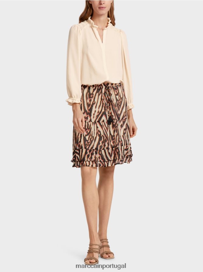 Esta saia é feita de crepe de viscose leve e recebe o peso necessário dos pandamentos na bainha . Ele tem um cordão nas gravatas da cintura e da fita que são finalizadas com uma borla decorativa.