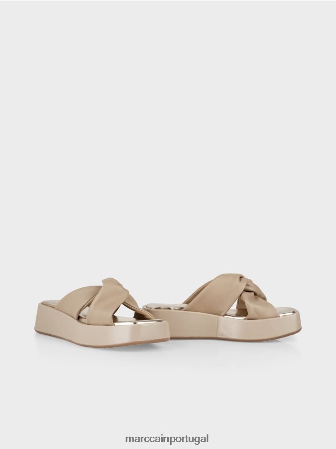 Mules elegantes com tiras macias. Os detalhes bem atados na alça cruzada oferecem a esses escorregadores um toque feminino. A palmada macia vem com um brilho requintado para combinar. Os sapatos têm um salto de cunha embrulhado de alta qualidade e uma forma quadrada contemporânea. A sola com as letras de Marc Cain em relevo é um recurso adicional encantador.
