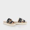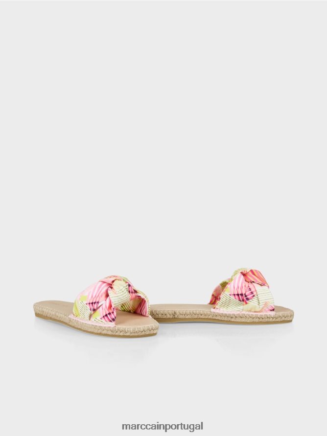 sandálias planas com uma linha externa arredondada. Essas sandálias apresentam uma alça de nó colorida em um tecido impresso. A sola arredondada parece carinhosamente costurada à mão. As sandálias são muito confortáveis de usar graças à mesa de pé macio.