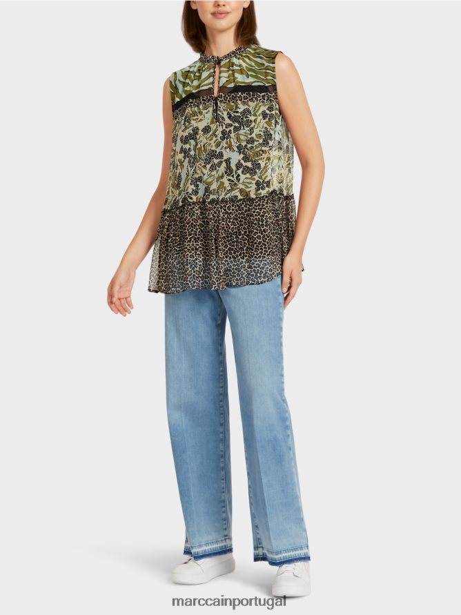 Esta parte superior em camadas é feita de Crepe fino de viscose. O padrão imaginativo é inspirado nos motivos de flora e fauna. As listras de malha e leopardo adicionam detalhes na frente. O colar de stand-up é levemente reunido e prende um botão e um loop.