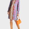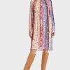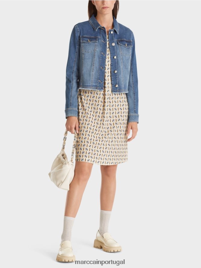 O vestido é apresentado com uma impressão de pontos e vem em uma silhueta descontraída. As mangas são longas e bloqueadas nas extremidades. A prega longitudinal na frente é um atraente adicional.