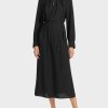 O vestido se apresenta com uma silhueta descontraída e uma parte da saia balançando com pequenos degraus de folga. O material leve e fluido garante um conforto agradável de usar. O item vem com um forro interno e um cordão no colarinho.