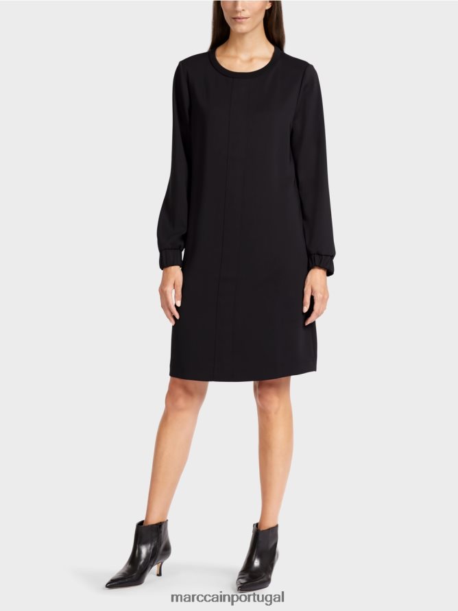 Este vestido curto e esportivo é casualmente solto e reto. Também pode ser usado com calças apertadas. O decote é finalizado com detalhes de malha com nervuras macias. A bainha da manga possui um acabamento elástico amplo. Os efeitos da costura na frente central criam uma aparência elegante.