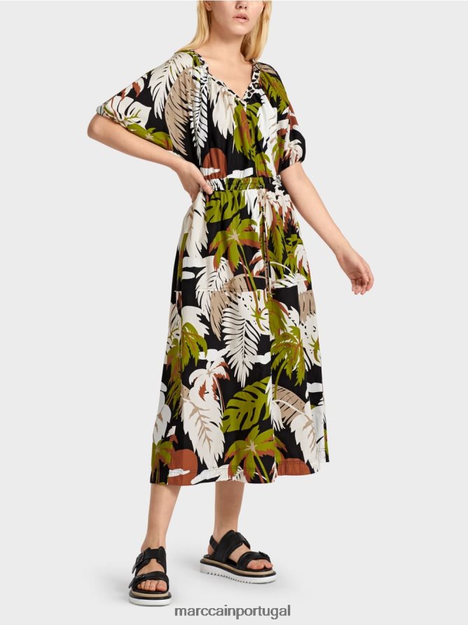 O motivo da folha estilizada dá a este vestido uma vibração legal dos anos setenta. Possui um decote em V, mangas de quimono e uma cintura de cordão, facilitando o uso. O decote em V na parte de trás faz com que pareça leve e arejado.
