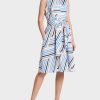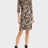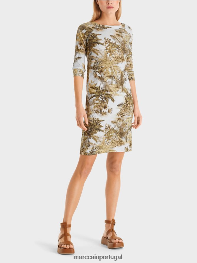 Vestido de abraço de figura em algodão elástico para conforto perfeito. O destaque é a impressão exótica da palmeira que chama a atenção de todos. O modelo possui mangas de três quartos e decote redondo.