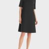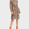 O vestido é feito de material fluido e tem uma silhueta que abraça o corpo. A cintura é enfatizada com a cintura elástica estreita e o cinto. O item se apresenta com algemas de decote em V e fenda. Um pequeno pingente de logotipo é colocado no pescoço.