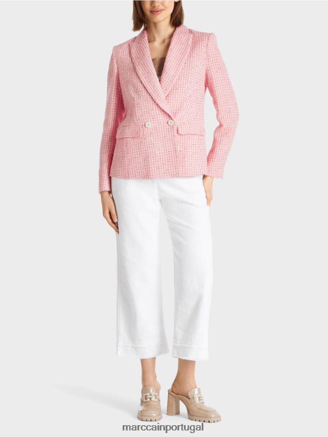 O blazer é feito a partir de tweed de algodão de verão com fios Lurex para um delicado efeito cintilante. O blazer tem uma silhueta ajustada e recebe dois botões. Os punhos são fenda e cada um tem três botões.