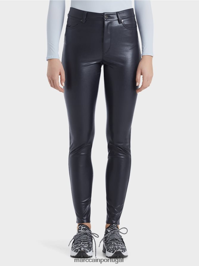 calças elegantes com um corte de figura, cintura alta e pernas estreitas. As calças de drenagem são feitas de couro de imitação ligeiramente brilhante e vêm com quatro bolsos, loops de correia, além de um botão de logotipo e fechamento de zíper.