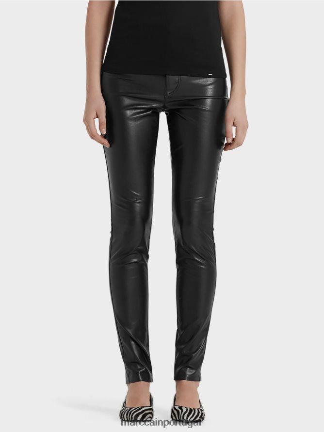 calças elegantes com um corte de figura, cintura alta e pernas estreitas. As calças de drenagem são feitas de couro de imitação ligeiramente brilhante e vêm com quatro bolsos, loops de correia, além de um botão de logotipo e fechamento de zíper.