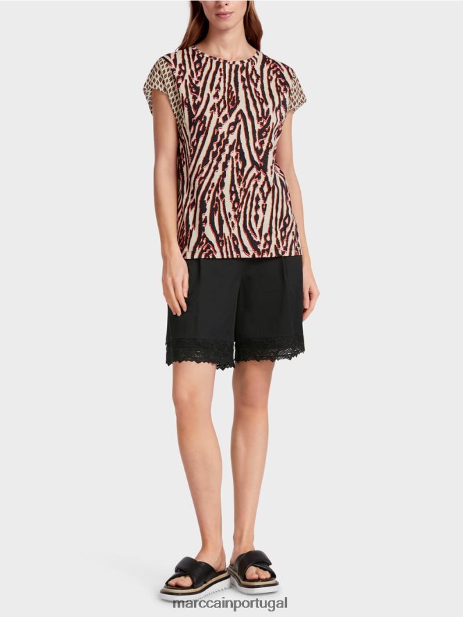 Esta camiseta é feita de algodão suave e leve. As inserções contrastantes de tecido são sugestivas de uma manga.