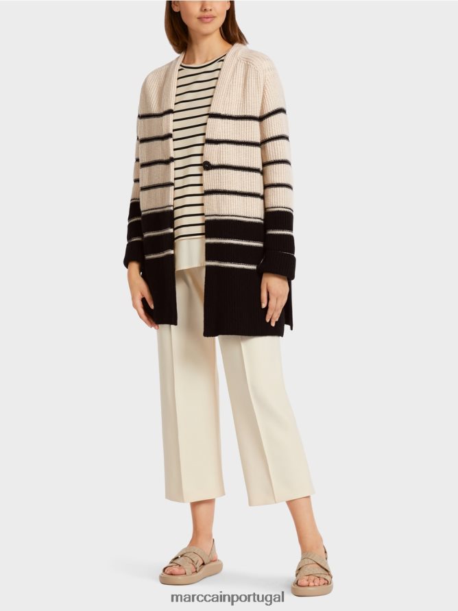 cardigã feito de lã de alta qualidade com caxemira e seda. Esta jaqueta de malha apresenta um impressionante padrão listrado náutico. Ele possui mangas de raglan e uma fixação de botões. Este item é “tricotado na Alemanha”. O fio é tricotado em máquinas de tricô ultra-modernas e passa por processos de acabamento têxtil em nossas instalações na Alemanha. As peças individuais, como as mangas, seções frontais etc., são costuradas por nossas empresas parceiras na Europa.