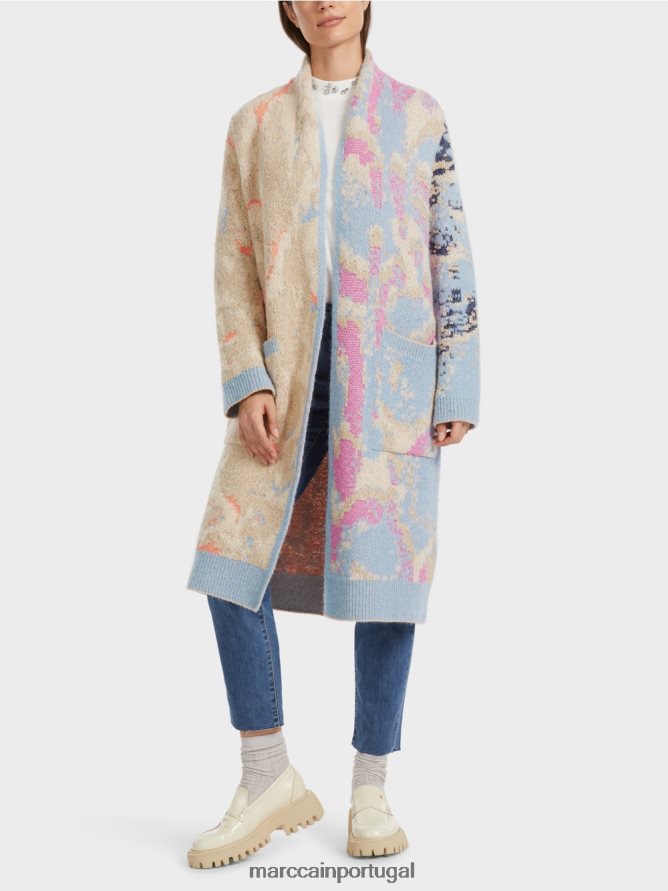 Este casaco de malha com padrões coloridos vem em uma mistura material de lã, mohair e alpaca. Também tem uma pontuação altamente com um corte longo, bem como amplo. O gola de xale e os bolsos de remendo completam o design. A peça é “tricotada na Alemanha”: o tricô dos fios em máquinas de tricô ultra-modernas e o acabamento dos tecidos são realizados na Alemanha. As partes individuais, como mangas, parte da frente, etc., são costuradas juntas em empresas parceiras europeias.