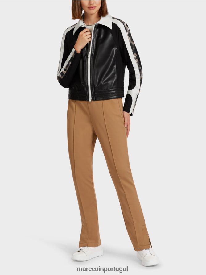jaqueta esportiva em um corte quadrado. Esta jaqueta está em uma mistura de material inteligente de padrão de leopardo e inserções em preto e branco. Possui um design de raglan e apresenta um colarinho de camisa grande e bolsos laterais. As bainhas da manga podem ser expandidas com um zip. Ele se prende com um zip de duas vias e um pino de imprensa. A bainha de pesos no topo aprimora a vibração esportiva.