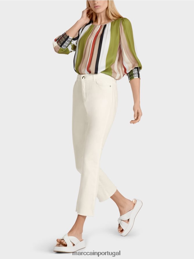 Esses jeans de cinco bolsos são feitos de algodão orgânico e carregam o rótulo de sustentabilidade “repensar”. Classic de frente, existem bolsos de renda nas costas e costuras ergonômicas. As bainhas estão com franjas.