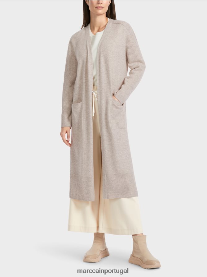 O casaco de malha longo tem um ajuste casual e solto e deve ser usado aberto. Possui uma linha em V, mangas baixas e fendas laterais altas. Na parte da frente, existem dois bolsos de remendo. Eficaz, o jogo com as diferentes estruturas: as mangas e o jugo dos ombros são nervurados e uma faixa corre pelo centro de volta em um padrão de malha.