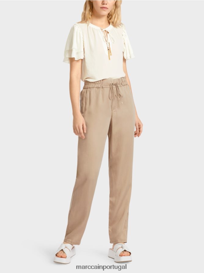 Essas calças de Rivera são amplas No quadril e a perna diminui até os tornozelos. A cintura é suave na frente e no estilo corredor nas laterais e nas costas. O cordão com elementos decorativos nas extremidades faz um recurso atraente. As calças têm bolsos de remendo nas costas. Esta peça de roupa é feita a partir da matéria -prima renovável Lyocell e leva o rótulo de sustentabilidade “Rethink Together”.