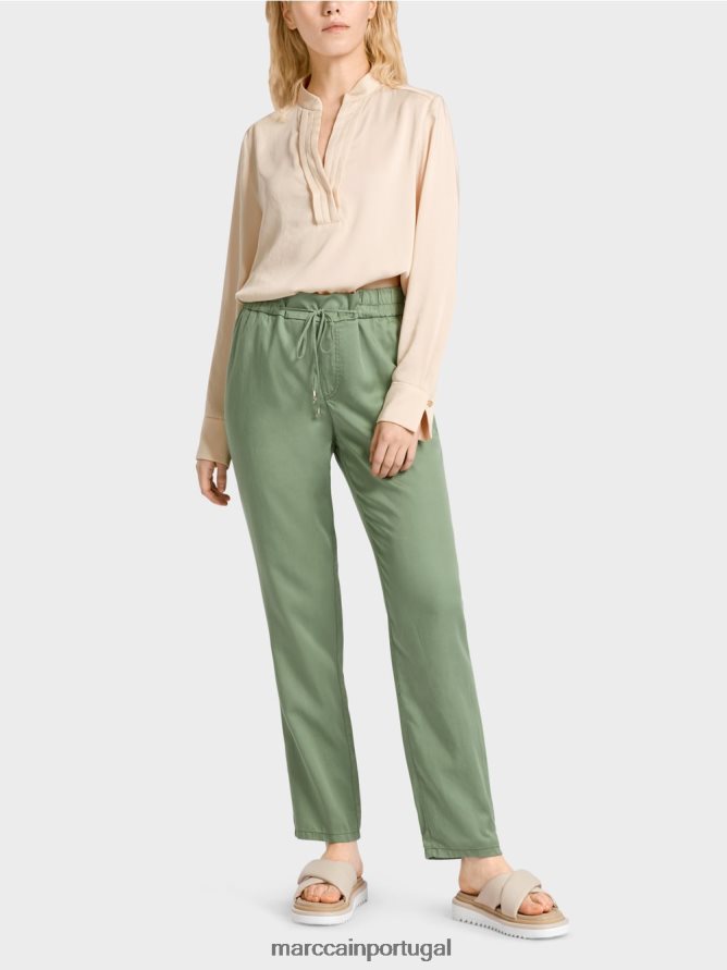 Essas calças de Rivera são amplas No quadril e a perna diminui até os tornozelos. A cintura é suave na frente e no estilo corredor nas laterais e nas costas. O cordão com elementos decorativos nas extremidades faz um recurso atraente. As calças têm bolsos de remendo nas costas. Esta peça de roupa é feita a partir da matéria -prima renovável Lyocell e leva o rótulo de sustentabilidade “Rethink Together”.