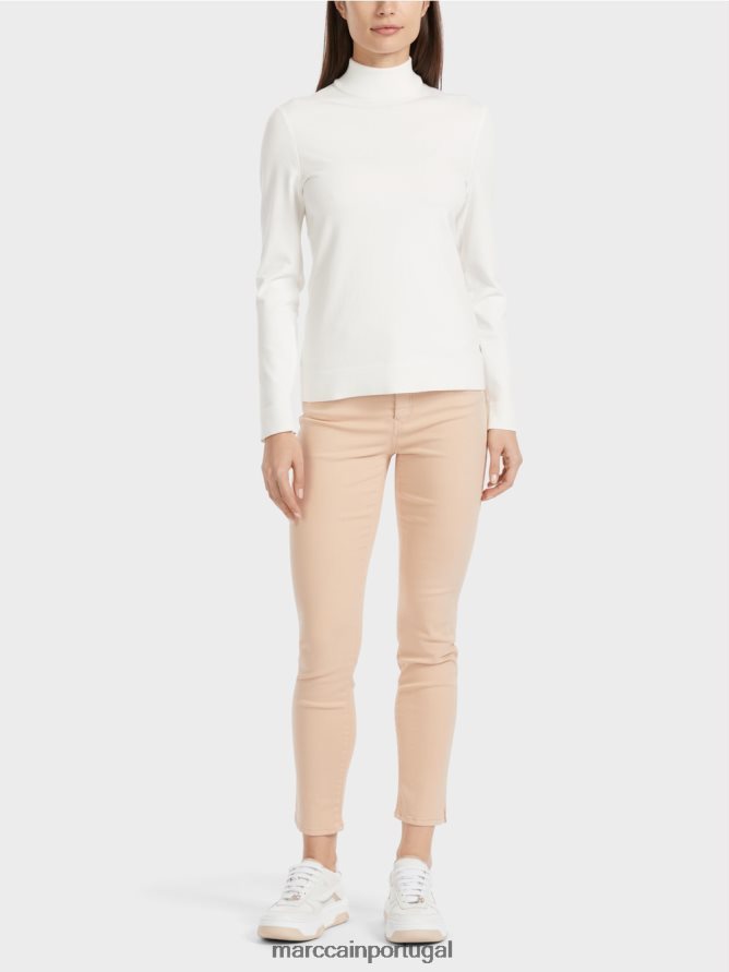 suéter de abraçar o corpo em um malha fina e suave à base de viscose. A gola é de pescoço alto. As mangas e a bainha são finalizadas com tricô clássico. O modelo carrega o rótulo de sustentabilidade “Rethink Together” e está tricotado e também terminado no local alemão. O processamento adicional das peças individuais é realizado por empresas parceiras européias. Isso significa que o item é “tricotado na Alemanha”.