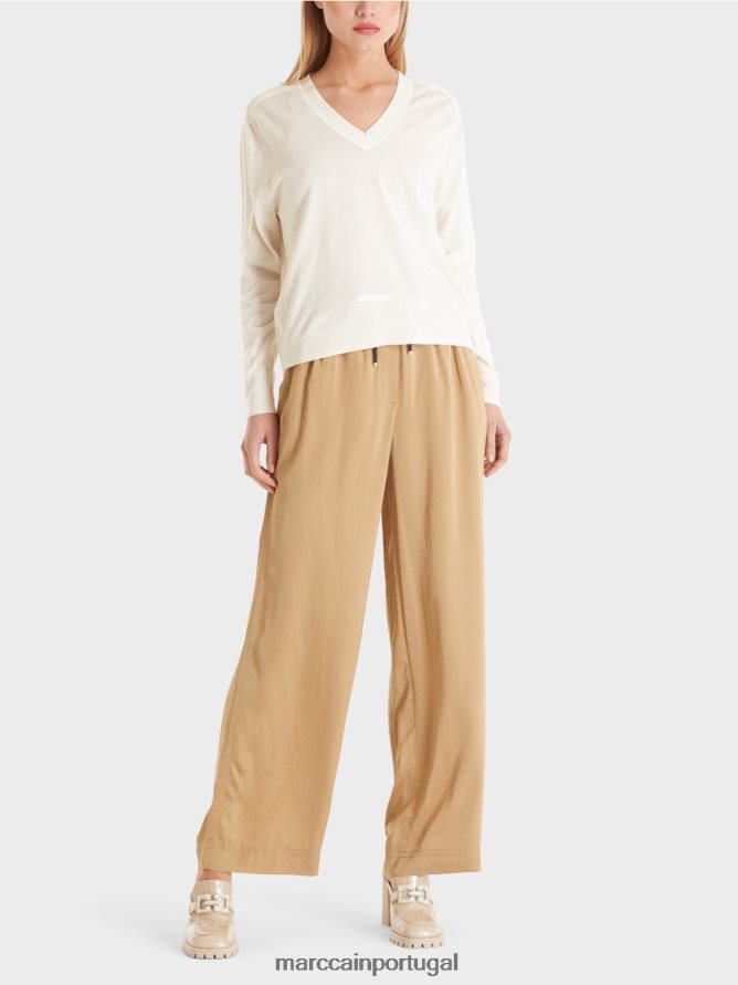 A silhueta fluida deste suéter é devido a uma fina mistura de fios de algodão e seda. O padrão texturizado que desce os ombros e as mangas adiciona um detalhe sutil. O decote, as mangas e a bainha são finalizados clássicos com punhos com nervuras.