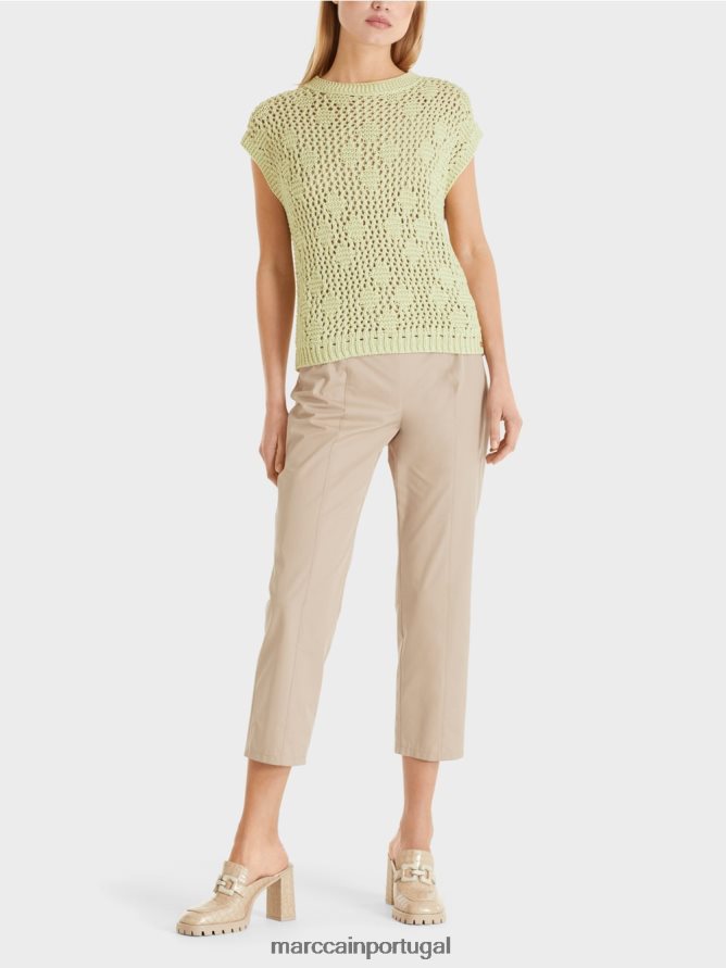 Top malha de grandes dimensões com ombros caídos. Possui uma traseira semelhante a uma malha, intercalada com diamantes uniformemente colocados. A forma reta é enfatizada pelas costuras laterais de malha com nervuras e buracos.